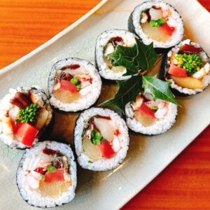 生本マグロ、うなぎ、いくら、数の子、貝柱、車海老、蟹身、大葉、菜の花、干瓢